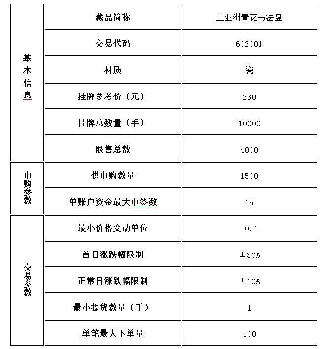經(jīng)景德鎮(zhèn)陶瓷交易所有限公司(以下稱本交易所)發(fā)行會員申請,本交易所專家委員會、新藏品掛牌審核小組評估審核通過,對已經(jīng)完成托管入庫的藏品《王亞洲青花書法盤》準予在本交易所線上實物交易系統(tǒng)正式掛牌交易,具體事項公告如下: