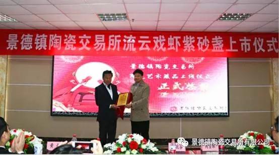 景德鎮(zhèn)陶瓷交易所董事何政谷為上海龍英藝術(shù)品投資有限公司頒發(fā)了藏品證書